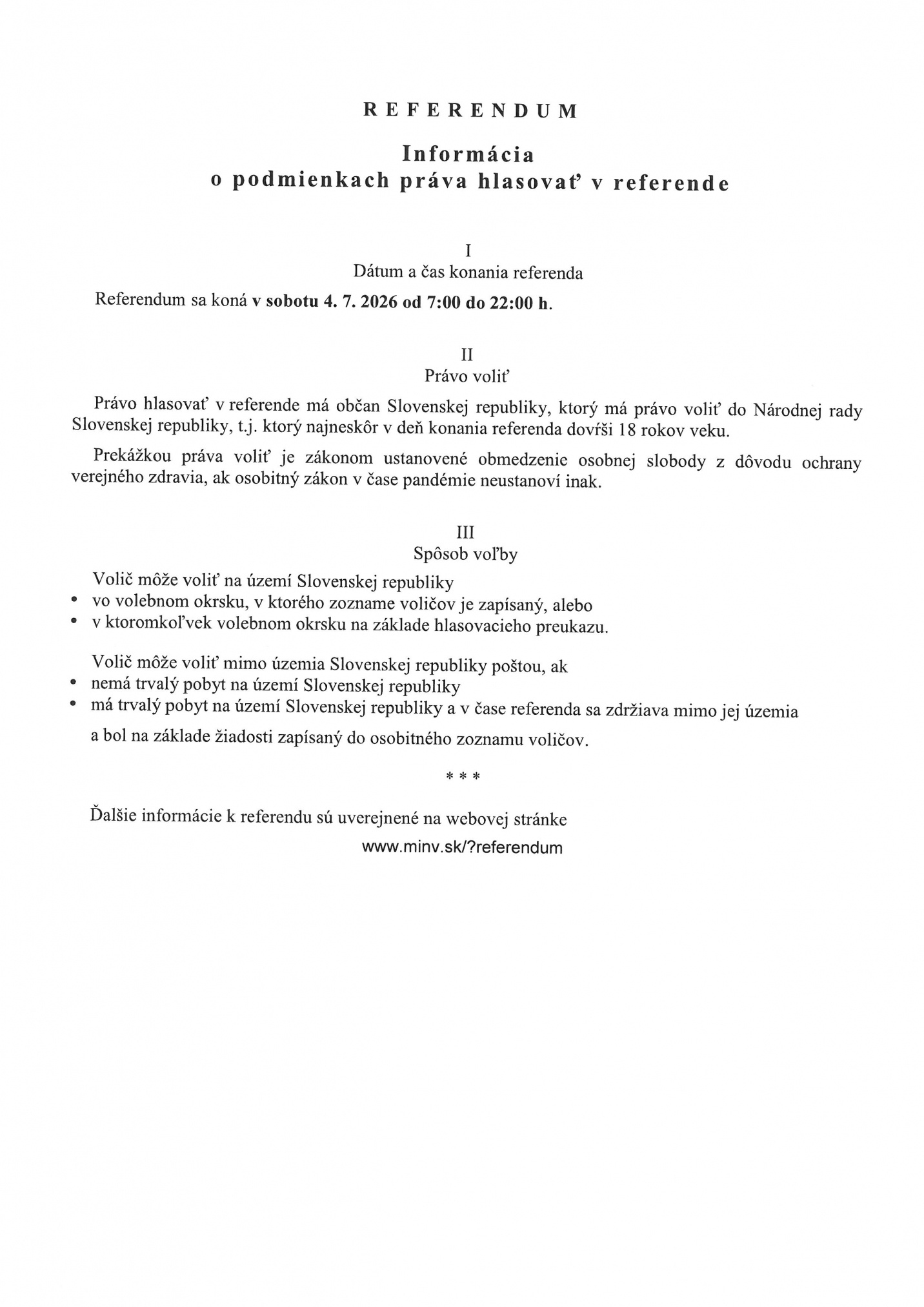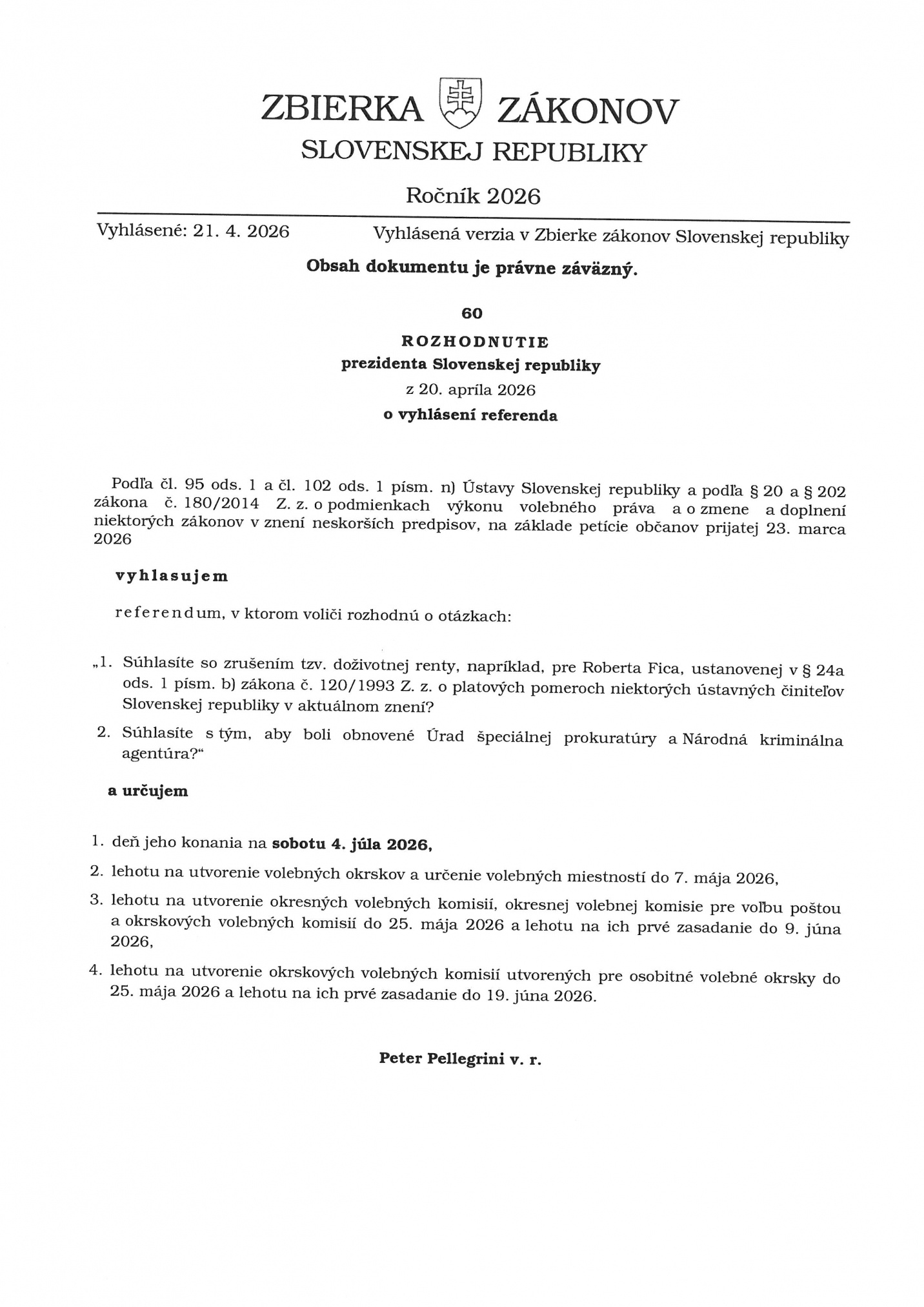• prezident Slovenskej republiky rozhodnutím č. 60/2026 Z. z. vyhlásil referendum a určil termín jeho konania na sobotu 4. júla 2026