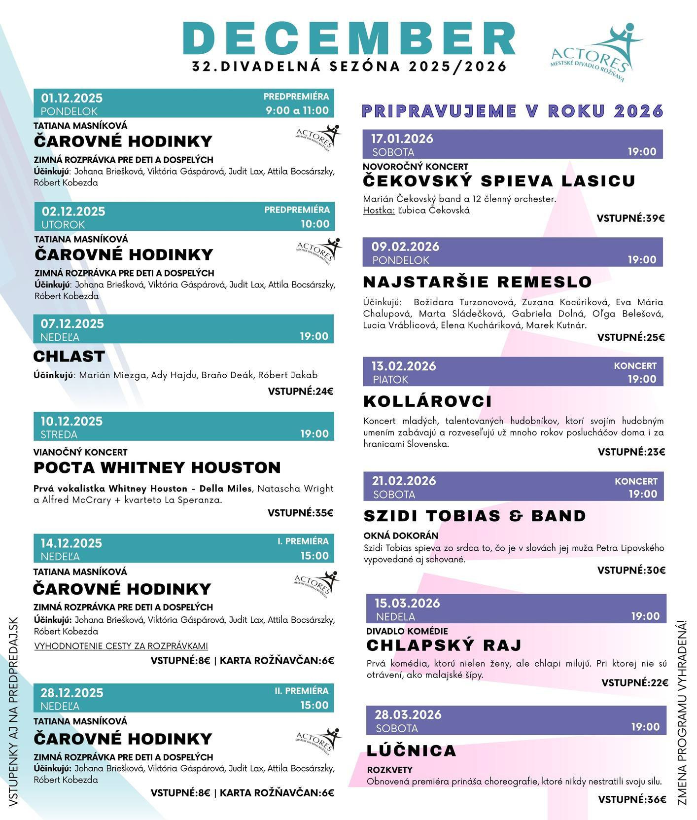 Actores divadlo v Rožňave ponúka program december 2025 - január 2026