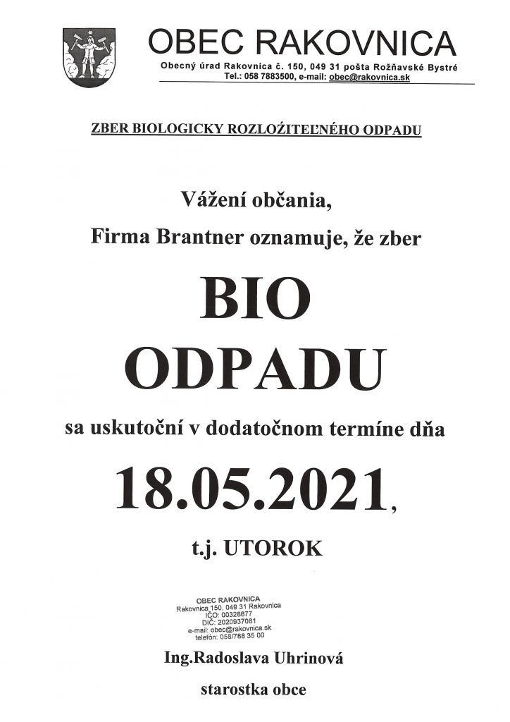 Dodatočný zber BIO ODPADU – utorok 18.05.2021
