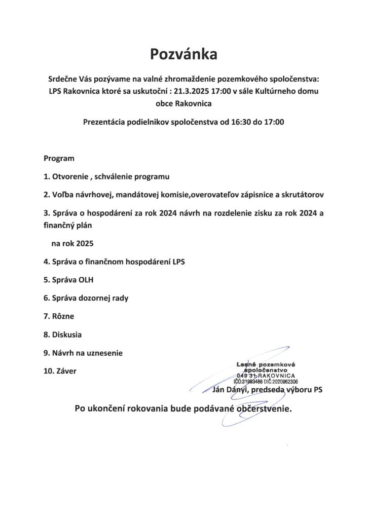LPS Rakovnica – Valné zhromaždenie pozemkového spoločenstva: 21.3.2025 o 17:00 h. v sále Kultúrneho domu v Rakovnici