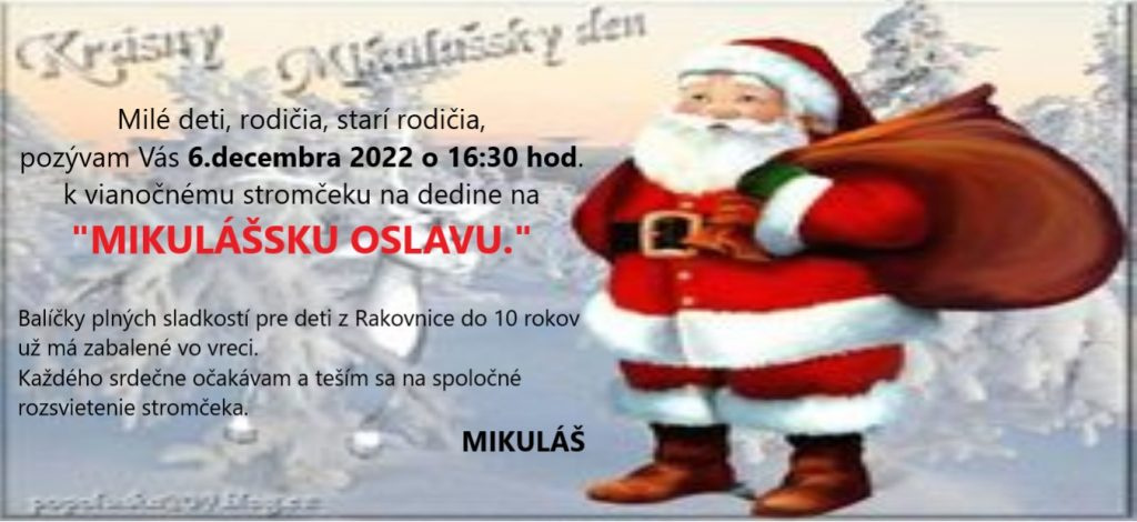 Mikuláš a Obec Rakovnica srdečne pozývajú všetky deti z Rakovnice do 10 rokov na stretnutie s Mikulášom, v utorok 06.12.2022 so začiatkom o 16:30 hod. na dedine pri stromčeku, ktorý spoločne rozsvietime a dobré detičky obdarí balíčkami plných dobrôt …