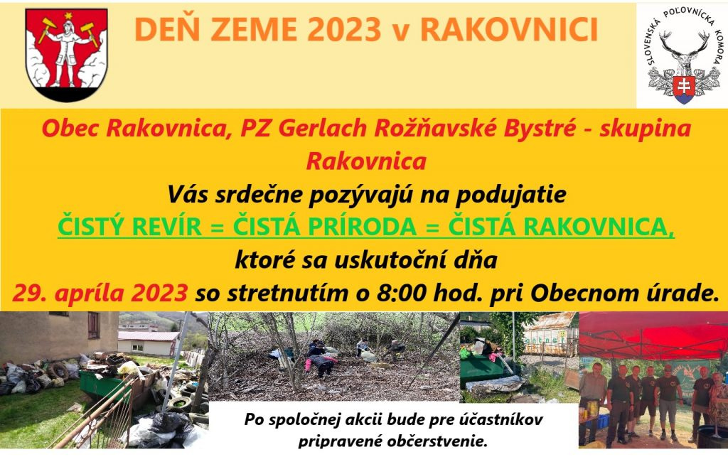 Obec Rakovnica a PZ Gerlach Rožňavské Bystré – skupina Rakovnica organizuje pri príležitosti Dňa Zeme brigádu „ČISTÝ REVÍR = ČISTÁ PRÍRODA“, ktorá sa uskutoční 29. apríla 2023 od 8:00 hod.
