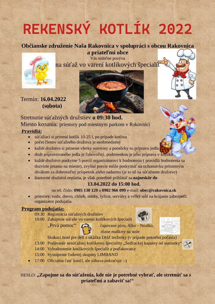 Na známosť sa dáva Ďalšia Dobrá Správa – v SOBOTU veľkonočnú dňa 16.04.2022 sa vidíme a zabávame spolu. Tešíme sa na Vás a Vašu dobrú náladu a hlavne na Vaše kulinárske umenie v podobe kotlíkových špecialít….