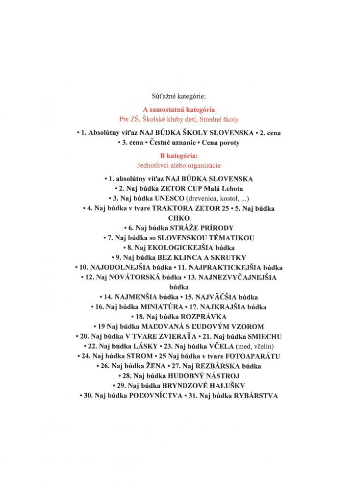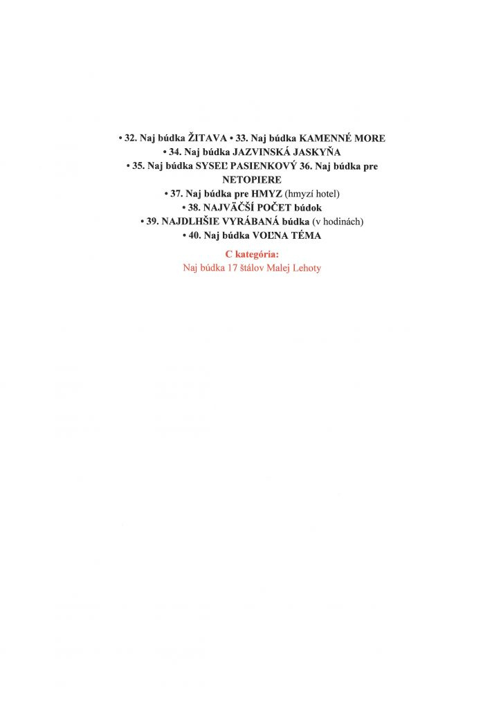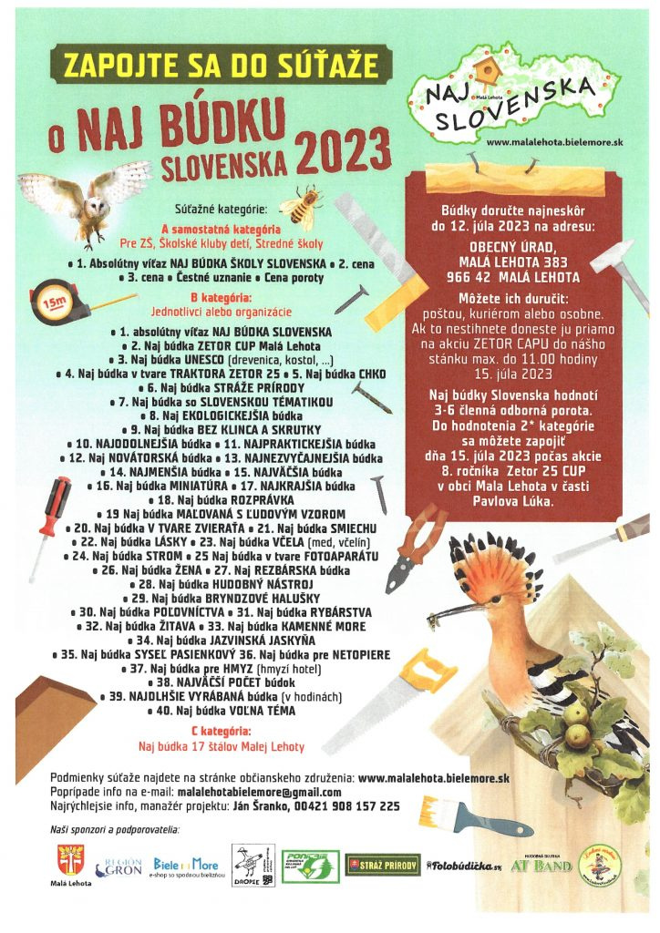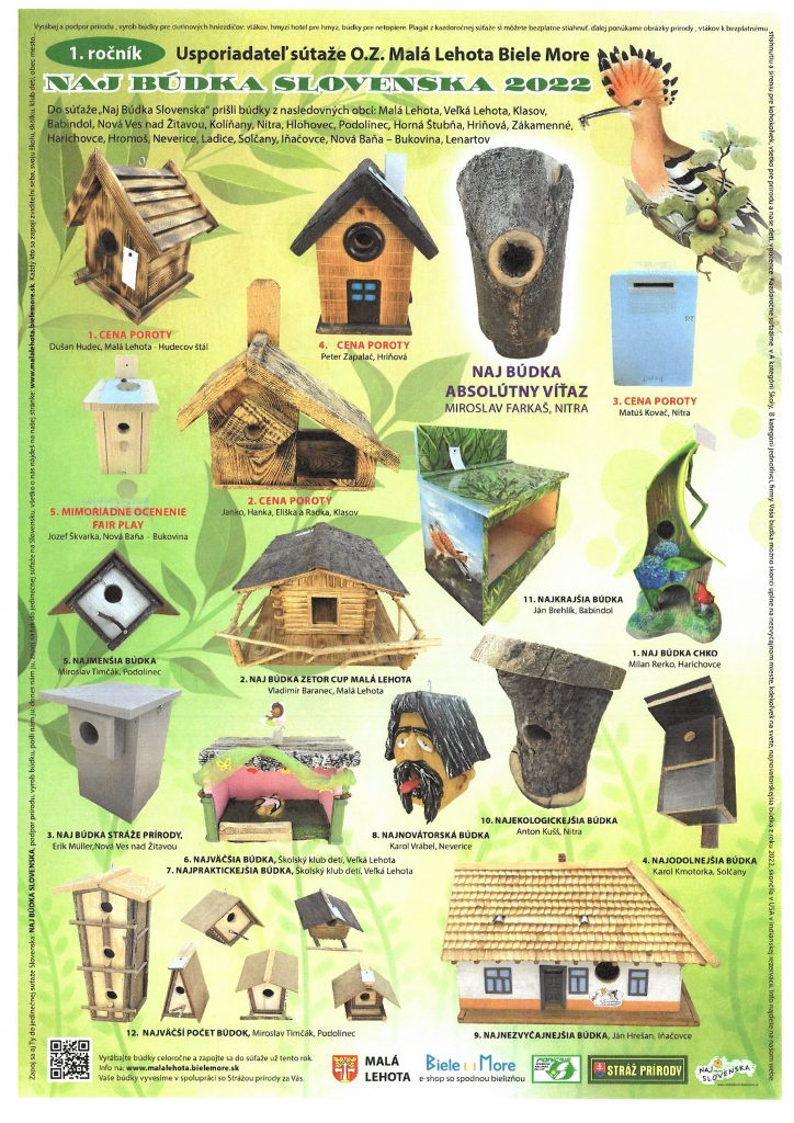 Už druhý rok organizuje súťaž s názvom NAJ BÚDKA SLOVENSKA 2023, ktorej cieľom je prijať a odbornou porotou ohodnotiť došlé búdky do súťaže na jednu z 40 tém a po súťaží ich inštaluje niekde v prírode a ešte Vám spravia reklamu( v horách,lesoch, hájoch,remízkach, parkoch, sadoch lúkach a pasienkoch.) Do súťaže sa môže zapojiť každý zo Slovenska aj sveta každý kto má rád prírodu a najmä vtáky.