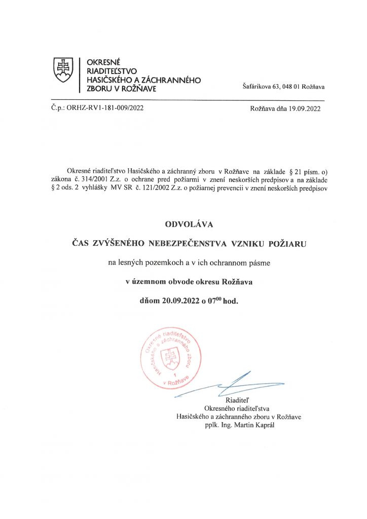 Odvolanie Vyhlásenia Času zvýšeného nebezpečenstva lesných požiarov