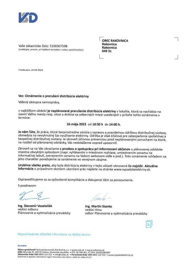 Oznámenie o prerušení distribúcie ELEKTRINY: dňa: 16.mája 2023 od 10.30h. do 14.00 h. , č.domov: 70-127, 221, 224-226, 230, 232, 244, 355, 364