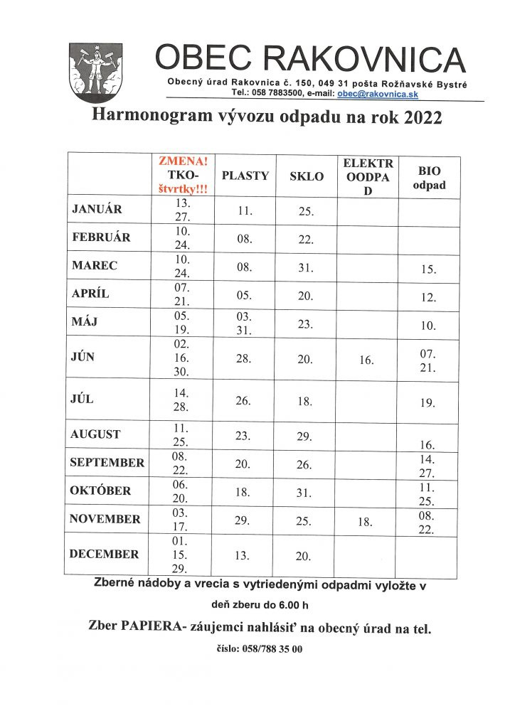 Plán zberu odpadu na rok 2022 POZOR ZMENA – vývoz TKO každý Š T V R T O K (nie PIATOK!)