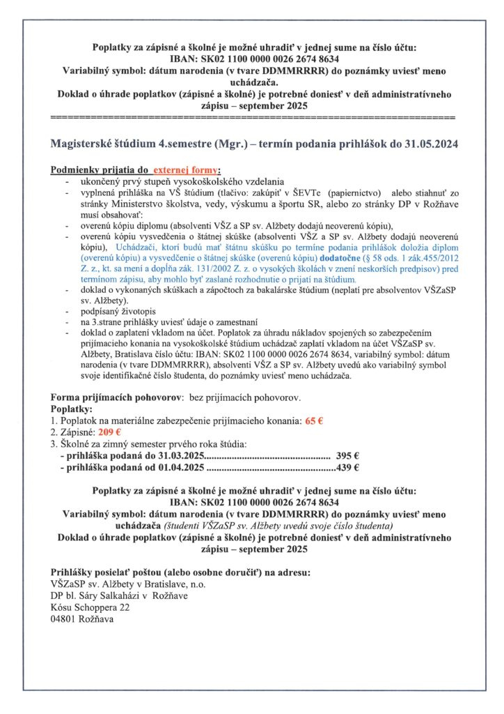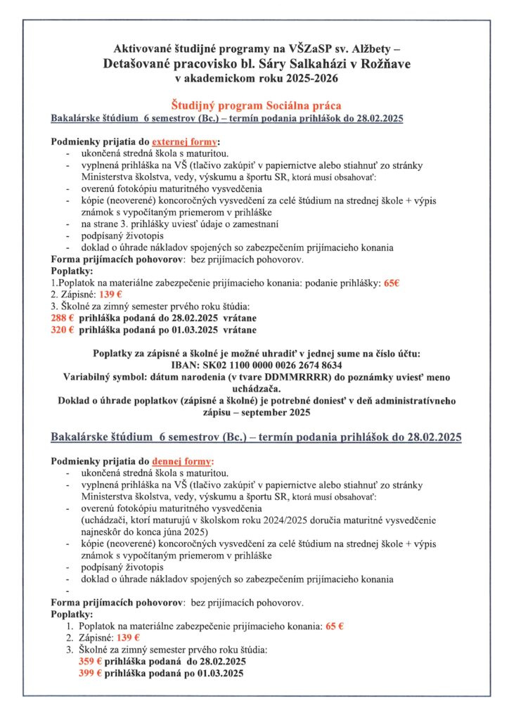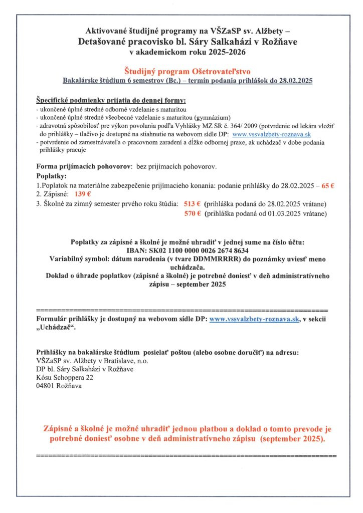 Ponuka možnosti štúdia na Vysokej škole zdravotníctva a sociálnej práce – VŠZaSP sv. Alžbety v Bratislave Detašované pracovisko Rožňava v akad. roku 2025/2026.