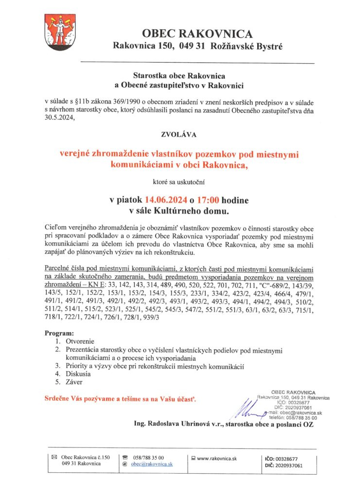 Pozvánka – Verejné zhromaždenie vlastníkov pozemkov pod miestnymi komunikáciami v obci Rakovnica dňa 14.06.2024 – piatok o 17.hodine v sále KD v Rakovnici