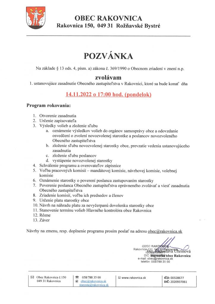 Pozvánka na 1. ustanovujúce zasadnutie OZ 14.11.2022 o 17.00 hod. – PONDELOK