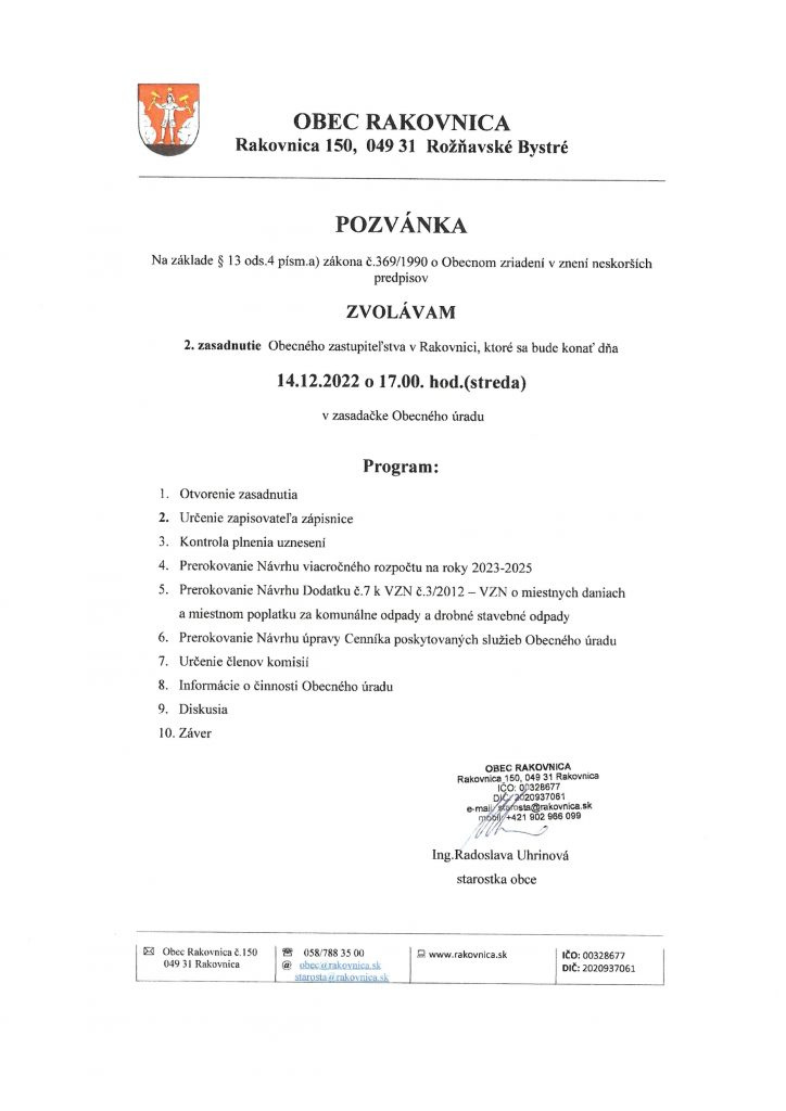 Pozvánka na 2.zasadnutie OZ dňa 14.12.2022 o 17.00 h.