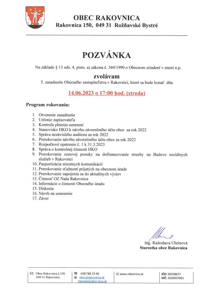 Pozvánka na 5. zasadnutie OZ dňa 14.06.2023 o 17:00 h.