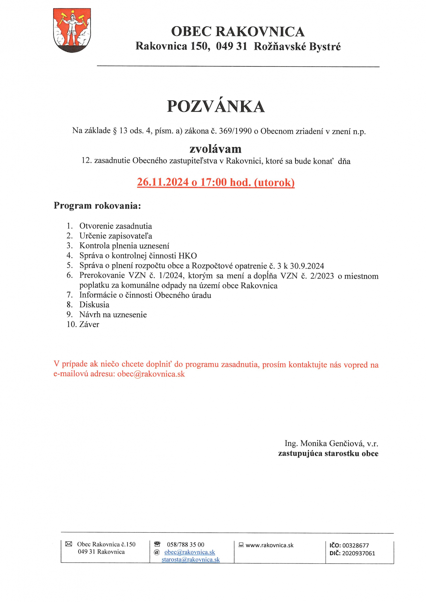 Pozvánka na OZ dňa 26.11.2024 – utorok o 17.00 hod.