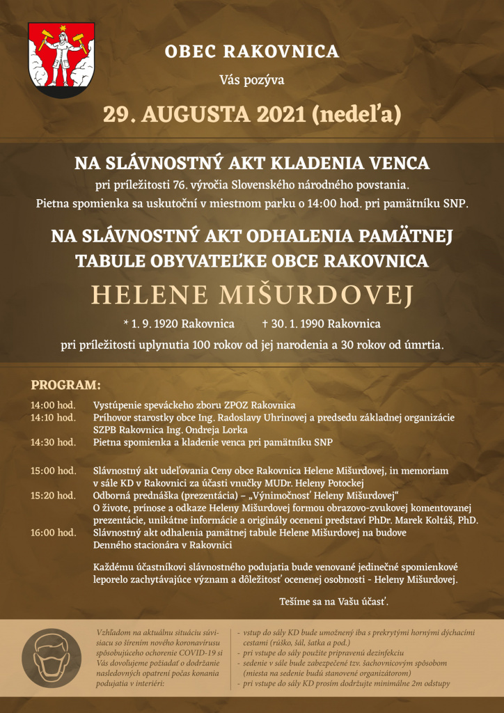 Pozývame Vás na Slávnostný akt kladenia venca pri pamätníku SNP a odhalenia pamätnej tabule p. Helene Mišurdovej IN MEMORIAM… 29. august 2021 NEDEĽA