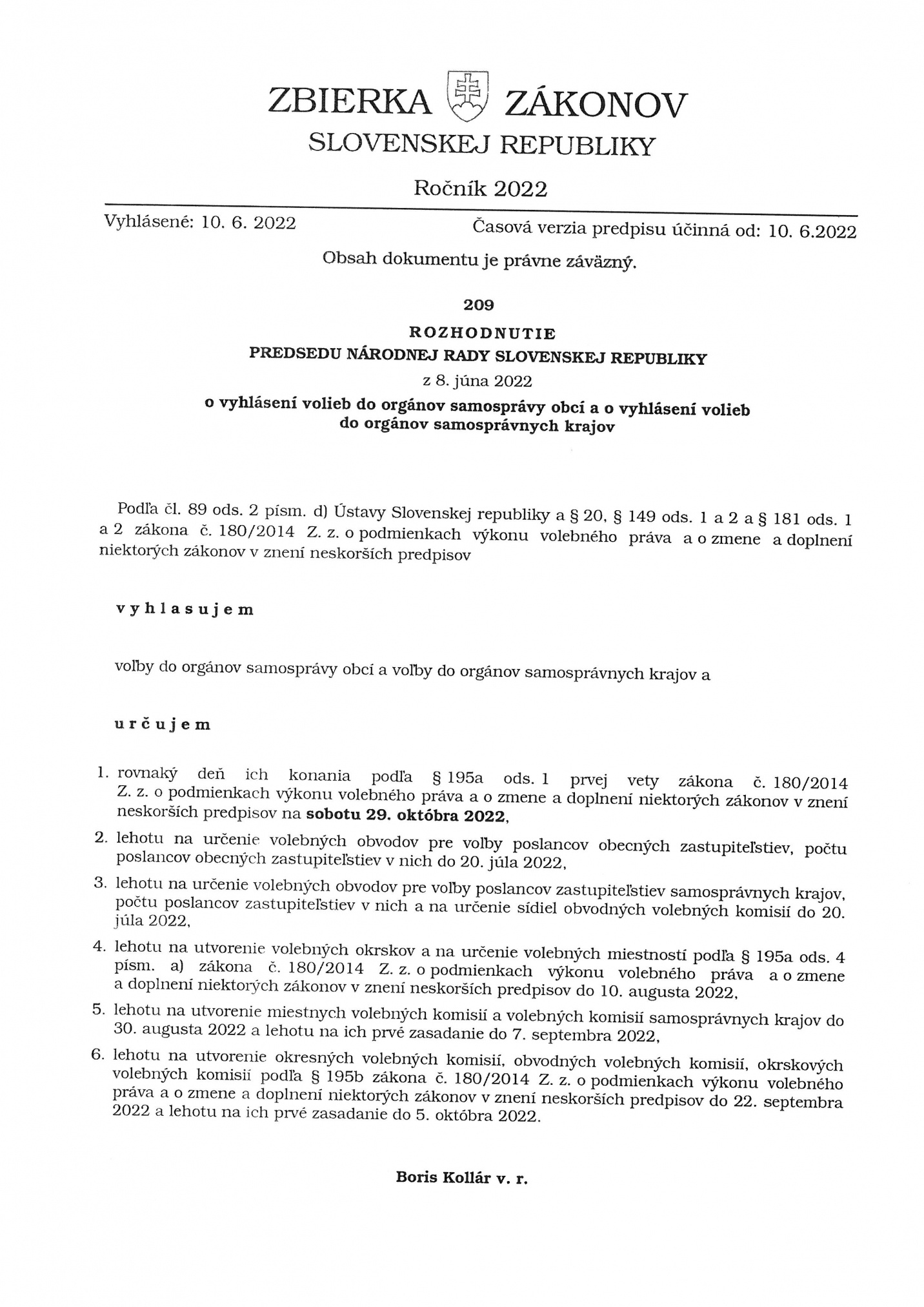 Rozhodnutie predsedu NR SR z 8.júna 2022 o výhlásení volieb do orgánov samosprávy obcí a do orgánov samosprávnych krajov