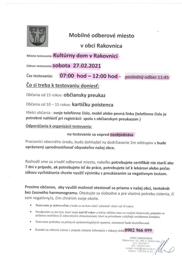 TESTOVANIE !!! – 6.kolo skríningového testovania na COVID-19 -SOBOTA 27.02.2021 od 7.00 h. do 12.00 h.