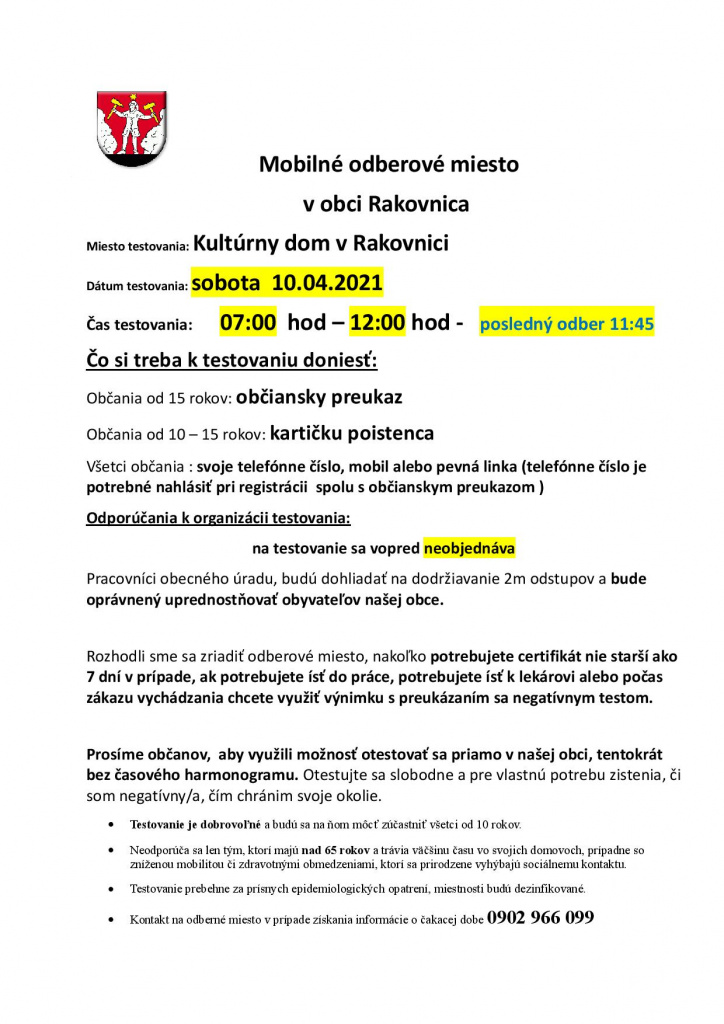 Testuje sa aj túto SOBOTU 10.apríla 2021 od 7.00 – 12.00 h.