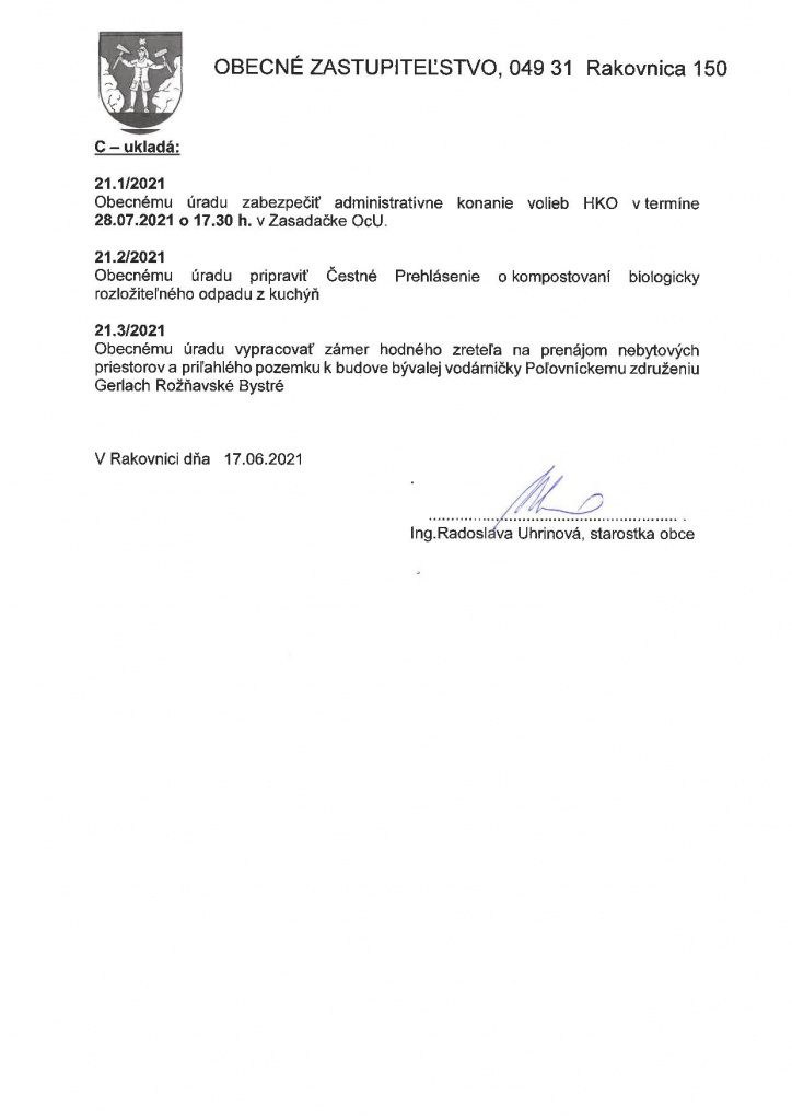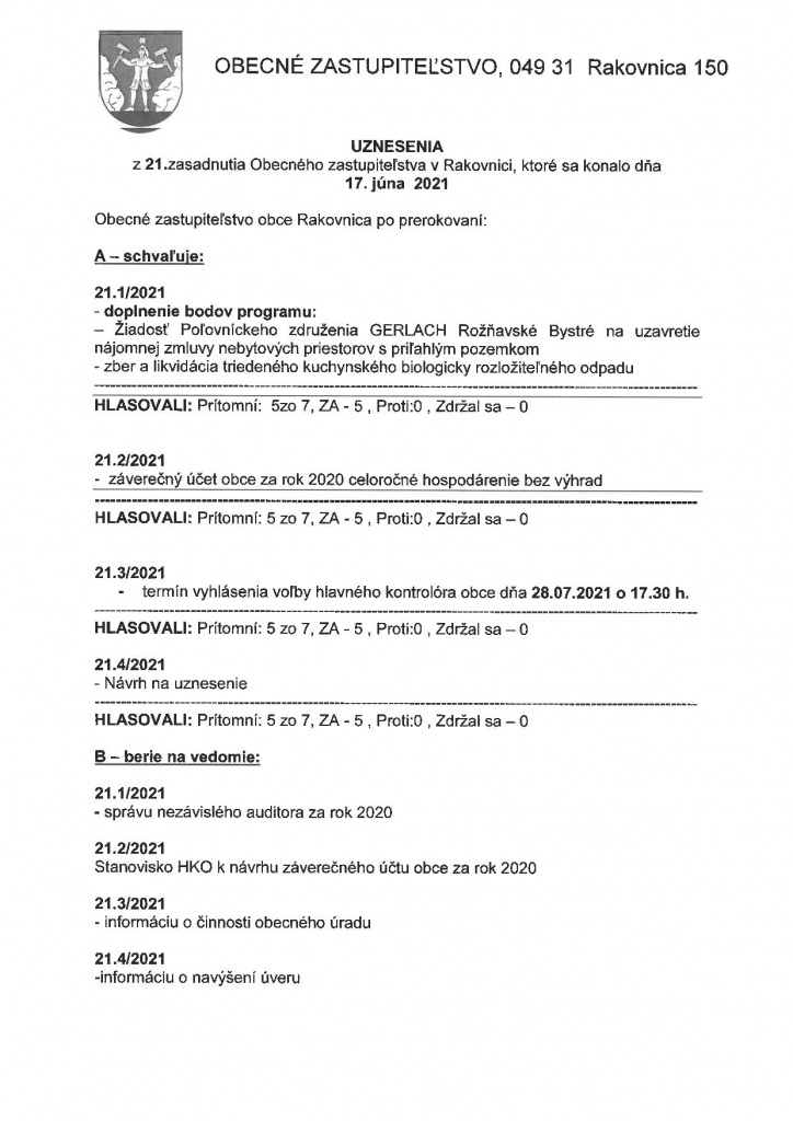 Uznesenia z 21.zasadnutia OZ dňa 17.06.2021
