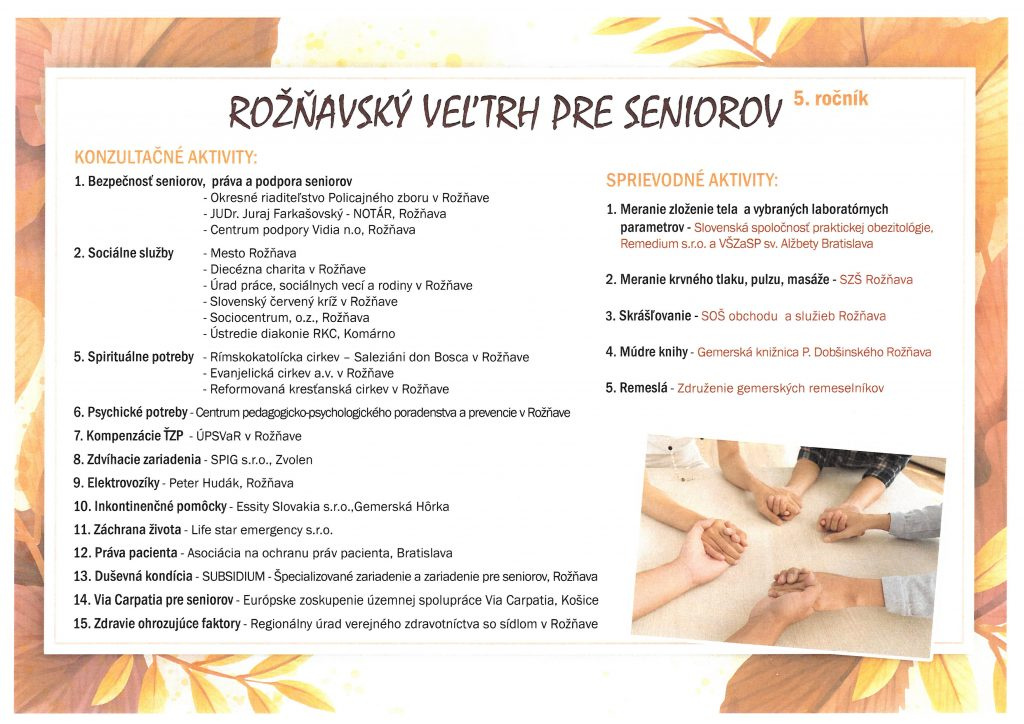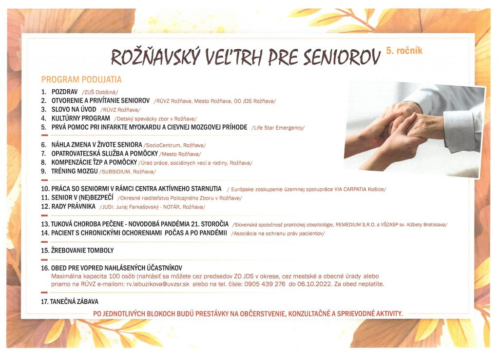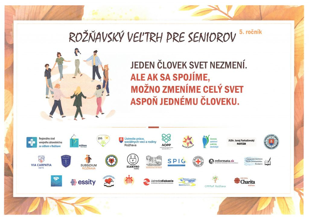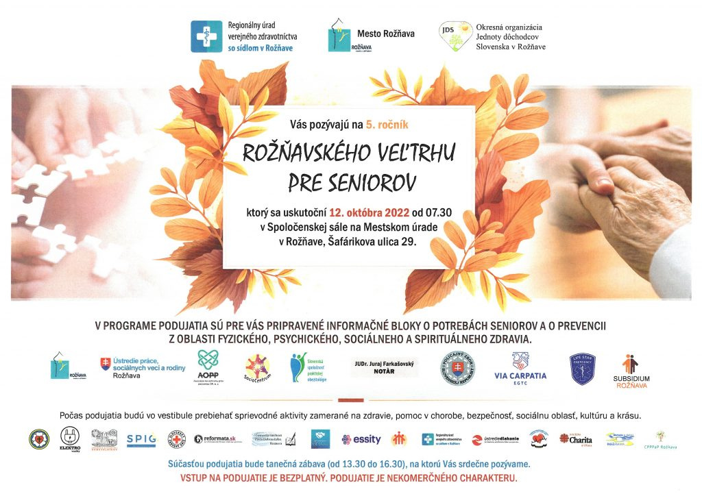 Regionálny úrad verejného zdravotníctva so sídlom v Rožňave, Mesto Rožňava a Okresná organizácia Jednoty dôchodcov Slovenska v Rožňave Vás pozývajú na 5. ročník Rožňavského veľtrhu pre seniorov. Podujatie sa uskutoční 12.októbra 2022 od 7.30 v Spoločenskej sále na Mestskom úrade v Rožňave na Šafárikovej ulici.