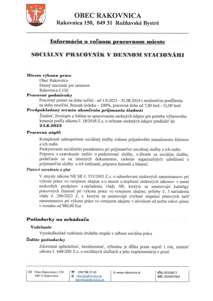 Voľné pracovné miesto – Denný stacionár Rakovnica