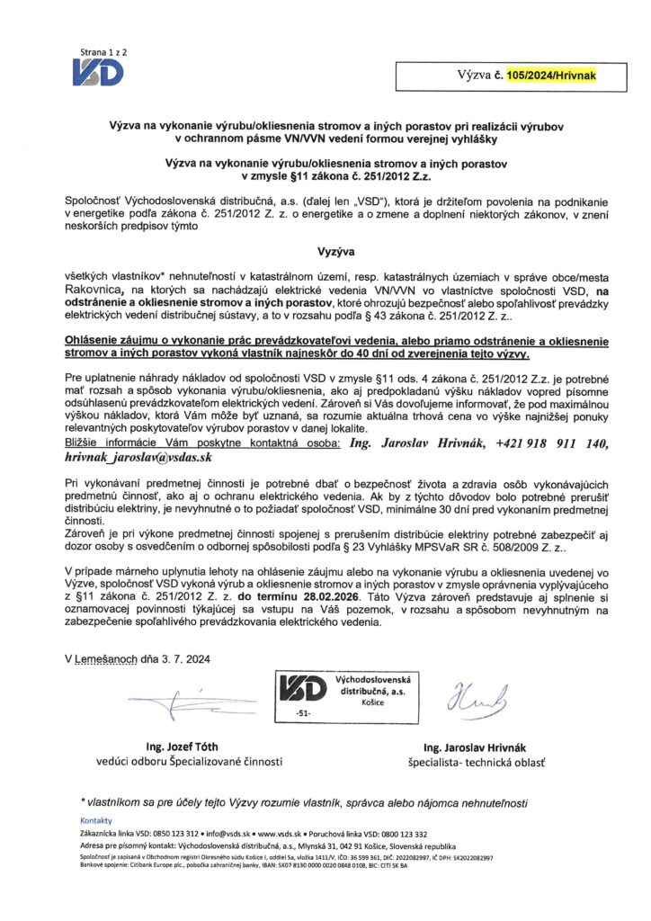 VSD – výzva na vykonanie výrubu/okliesnenia stromov a porastov v zmysle §11 zákona č.251/2012 Z.z.