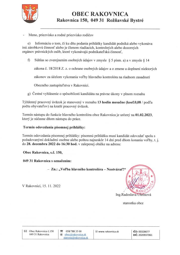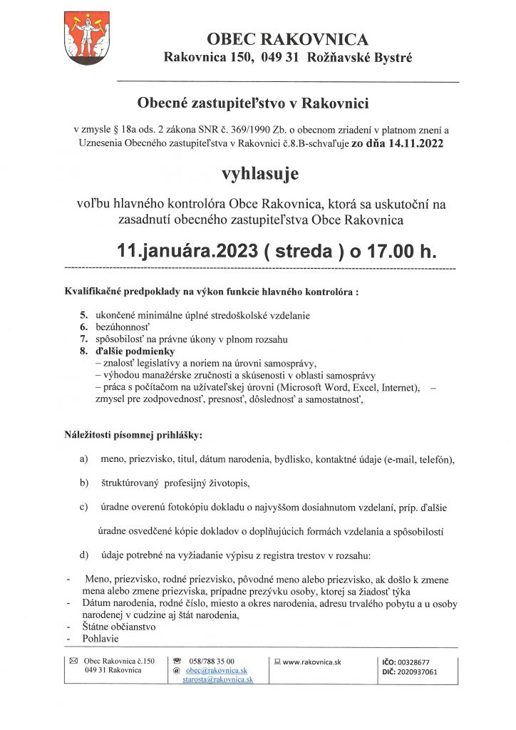 Vyhlásenie Voľby Hlavného kontrolóra obce Rakovnica na deň 11.januára 2023