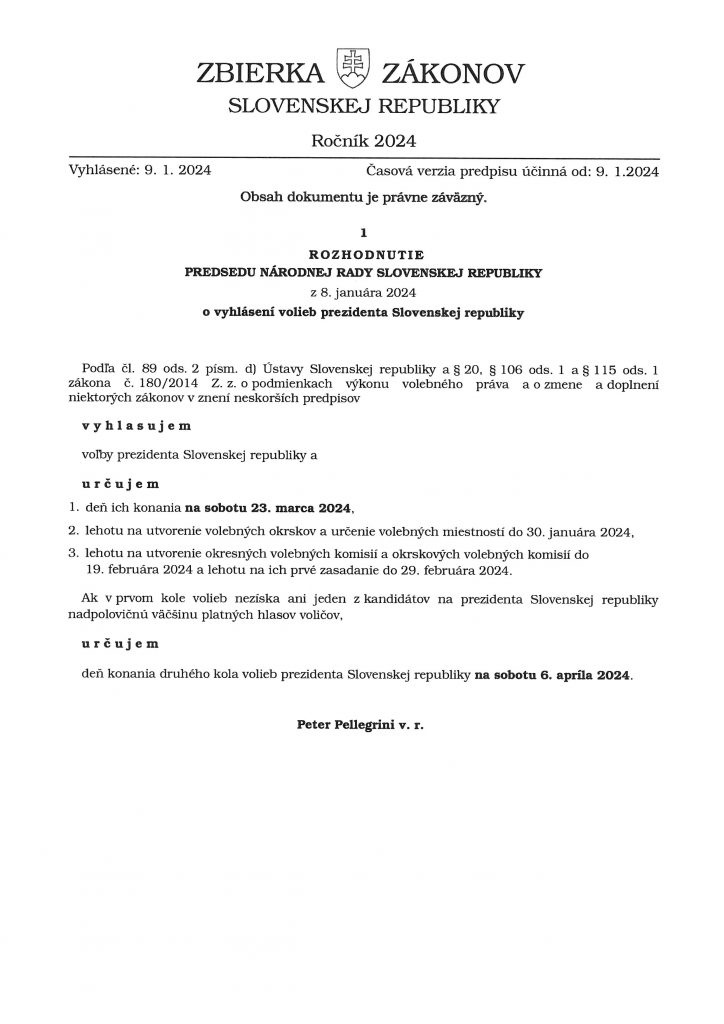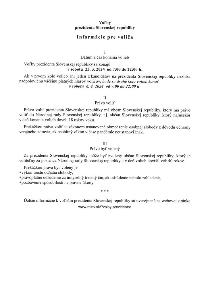 Vyhlásenie Volieb prezidenta na deň: 23.3.2024 a Informácie pre voličov