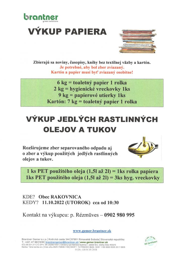 Výkup papiera a jedlých rastl.olejov a tukov – 11.10.2022 – UTOROK – od 10:30