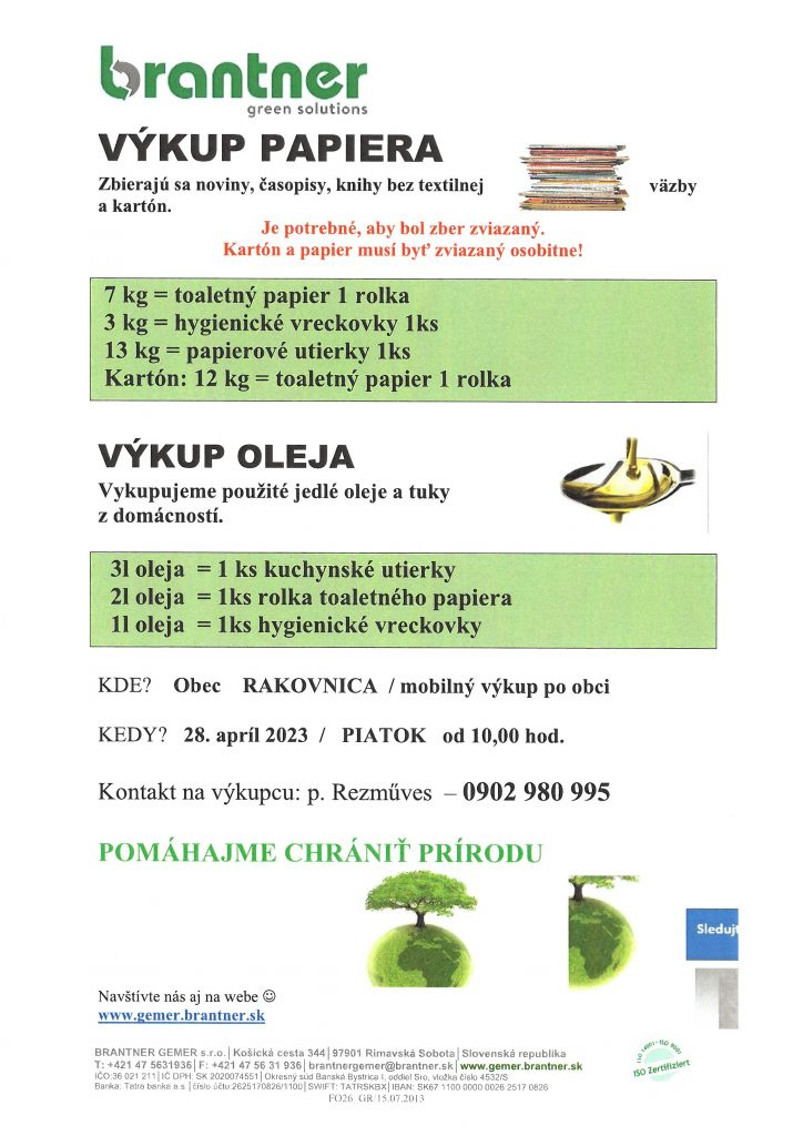 Výkup PAPIERA a olejov PIATOK 28.4.2023 od 10.00 h.