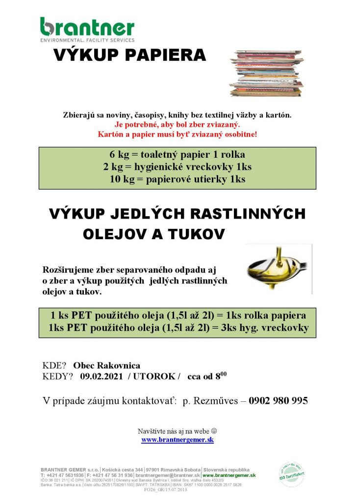 Výkup PAPIERA a POUŽITýCH JEDLÝCH OLEJOV- utorok 09.02.2021 o 8.00 h.