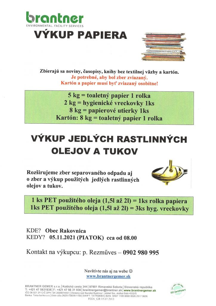 Výkup PAPIERA a POUŽITÝCH OLEJOV 5.11.2021 od 08.00 h.