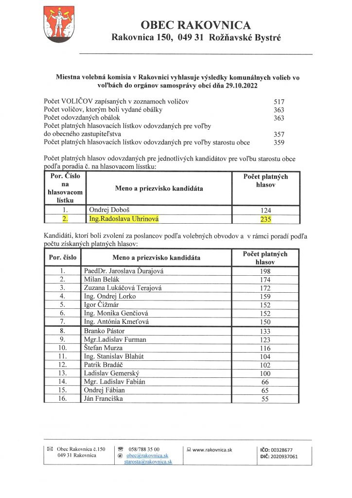 Výsledky komunálnych volieb vo Voľbách do Orgánov samosprávy obcí v Rakovnici , ktoré sa konali dňa 29.10.2022