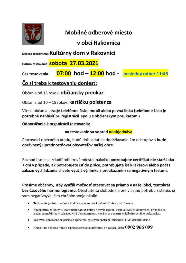 X.kolo testovania na COVID-19 sobota 27.marca 7.00 – 12.00 h.