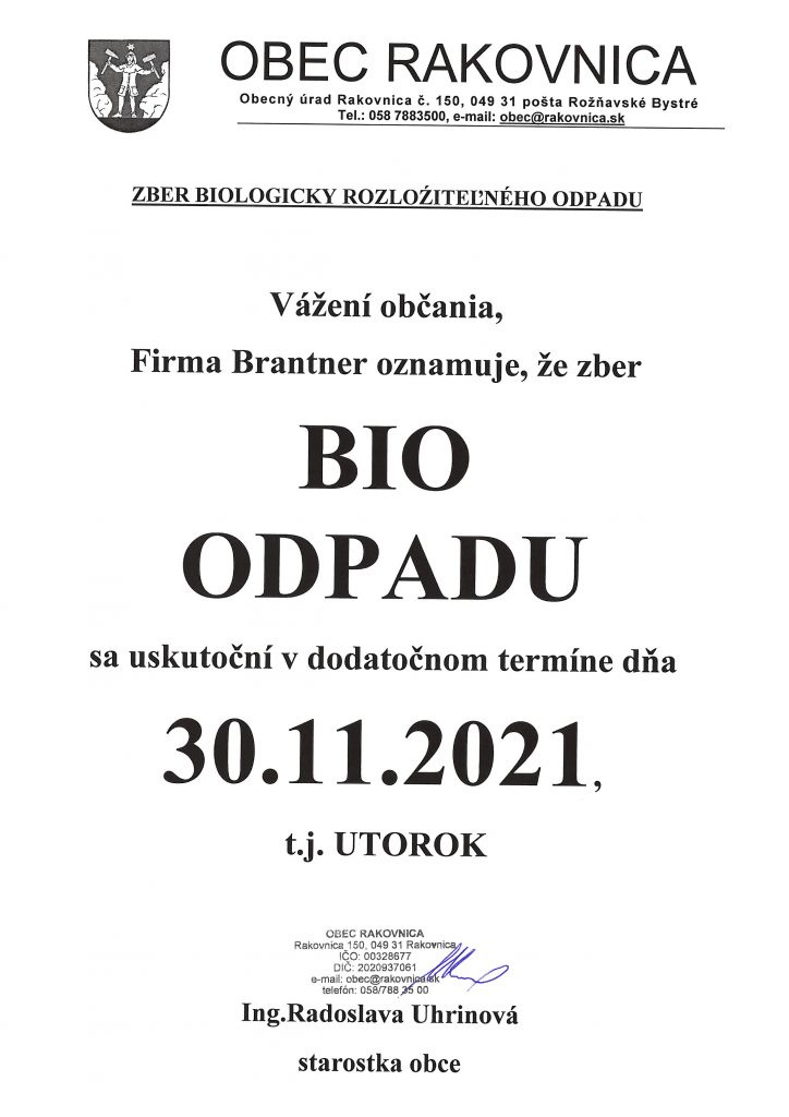Zber BIO odpadu – posledný v roku 2021 30.11.2021 – U T O R O K