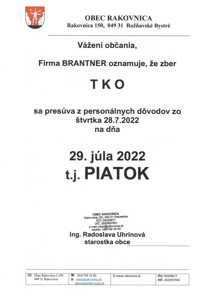 Zmena termínu vývozu TKO z 28.júla na PIATOK 29.júla 2022 !!!