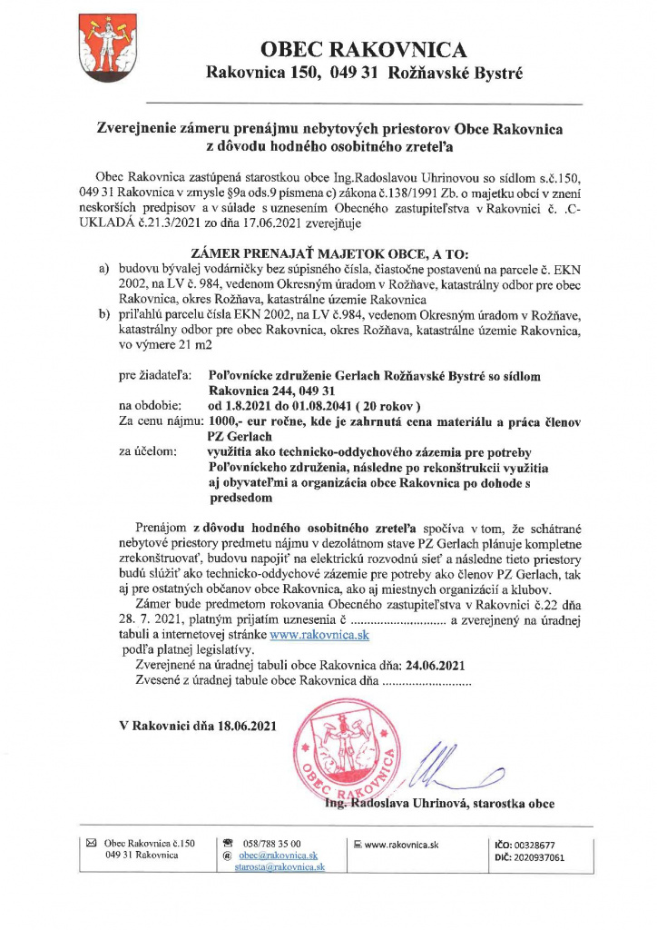 Zverejnenie zámeru na prenájom nebytových priestorov majetku obce